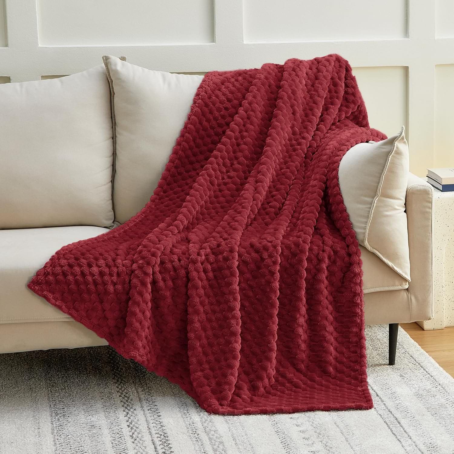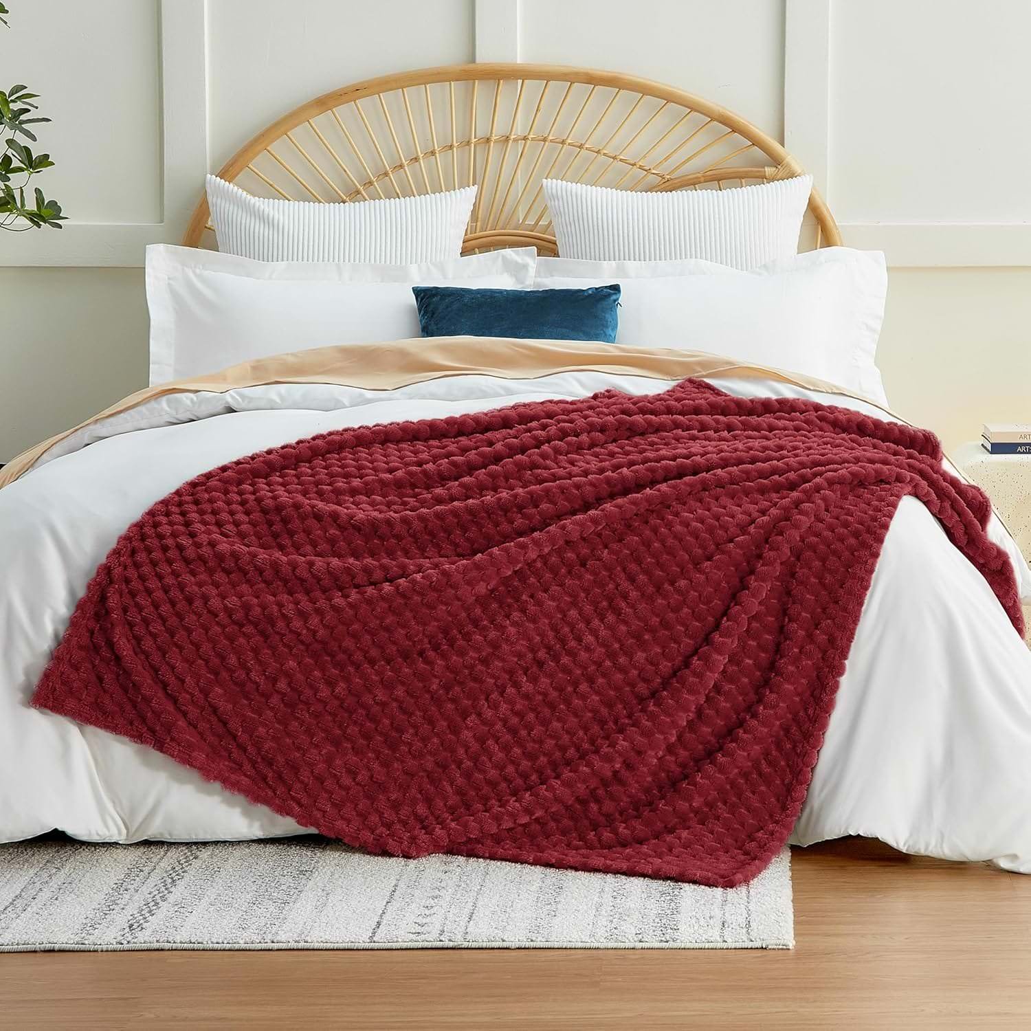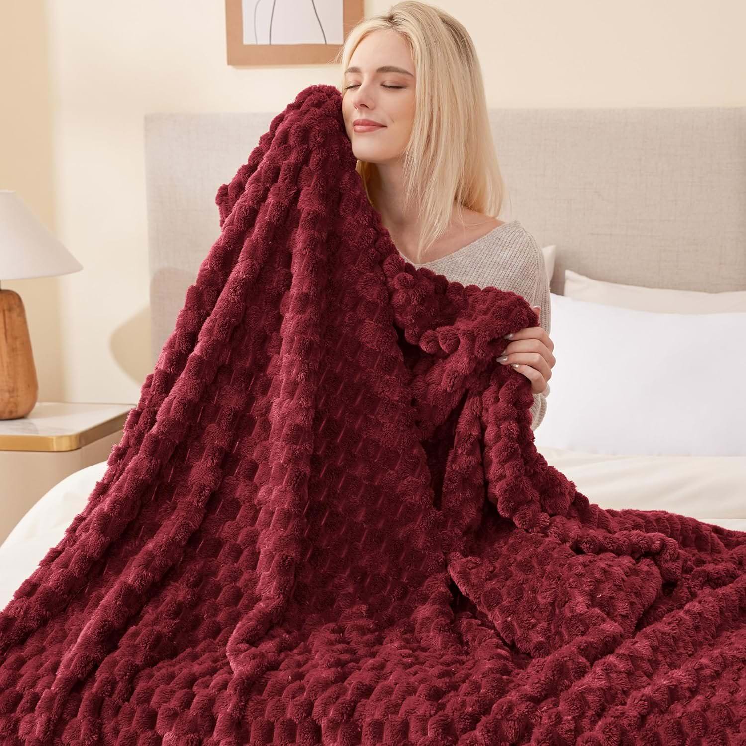 Dekoracyjny, wypukły wzór pięknie podkreśla strukturę koca i sprawia, że produkt wygląda efektownie nawet wtedy, gdy jest swobodnie ułożony na sofie lub łóżku. Bordowy kolor dodaje wnętrzu głębi, ciepła i eleganckiego akcentu. Dobrze komponuje się z beżem, kremem, szarością, czernią, drewnem oraz złotymi dodatkami.