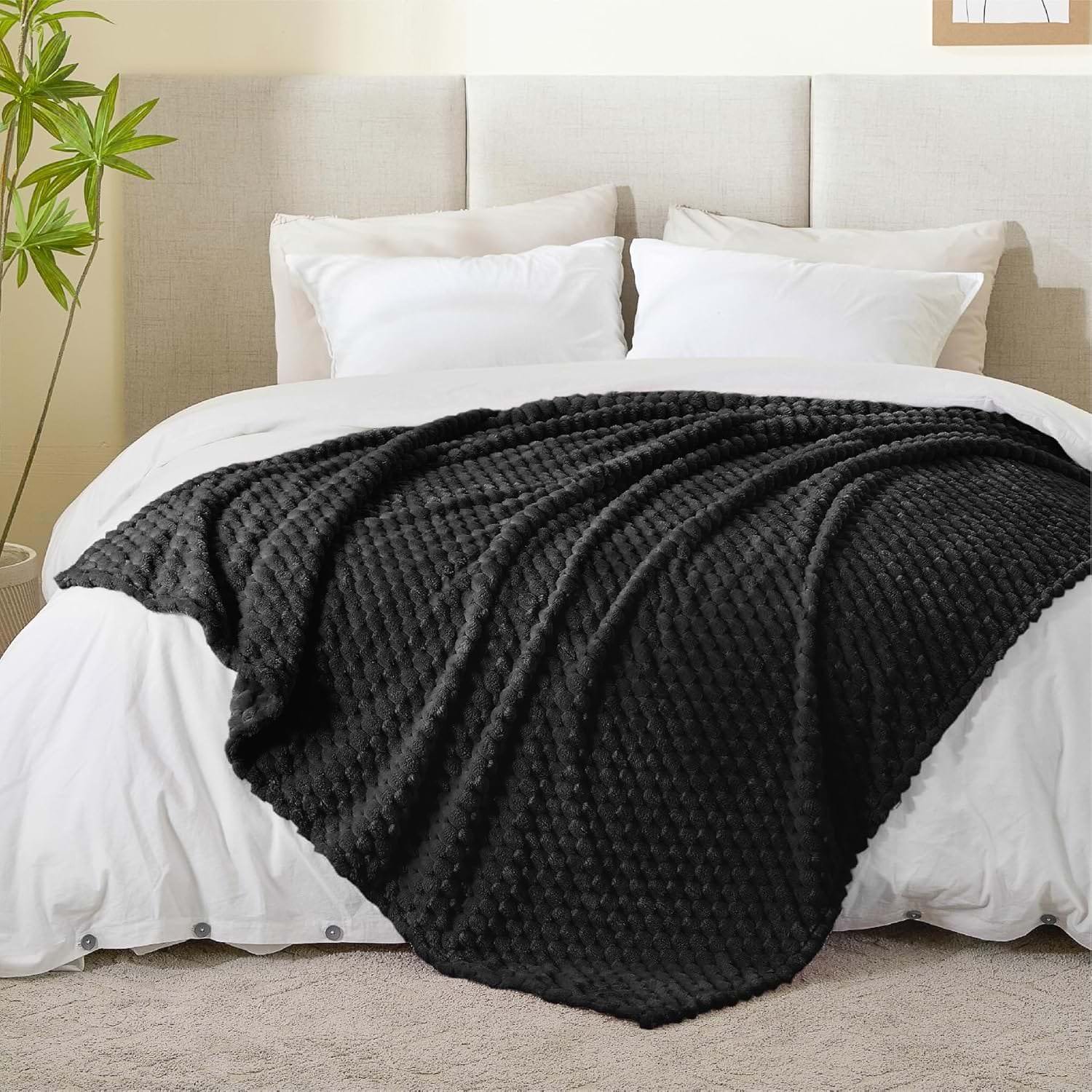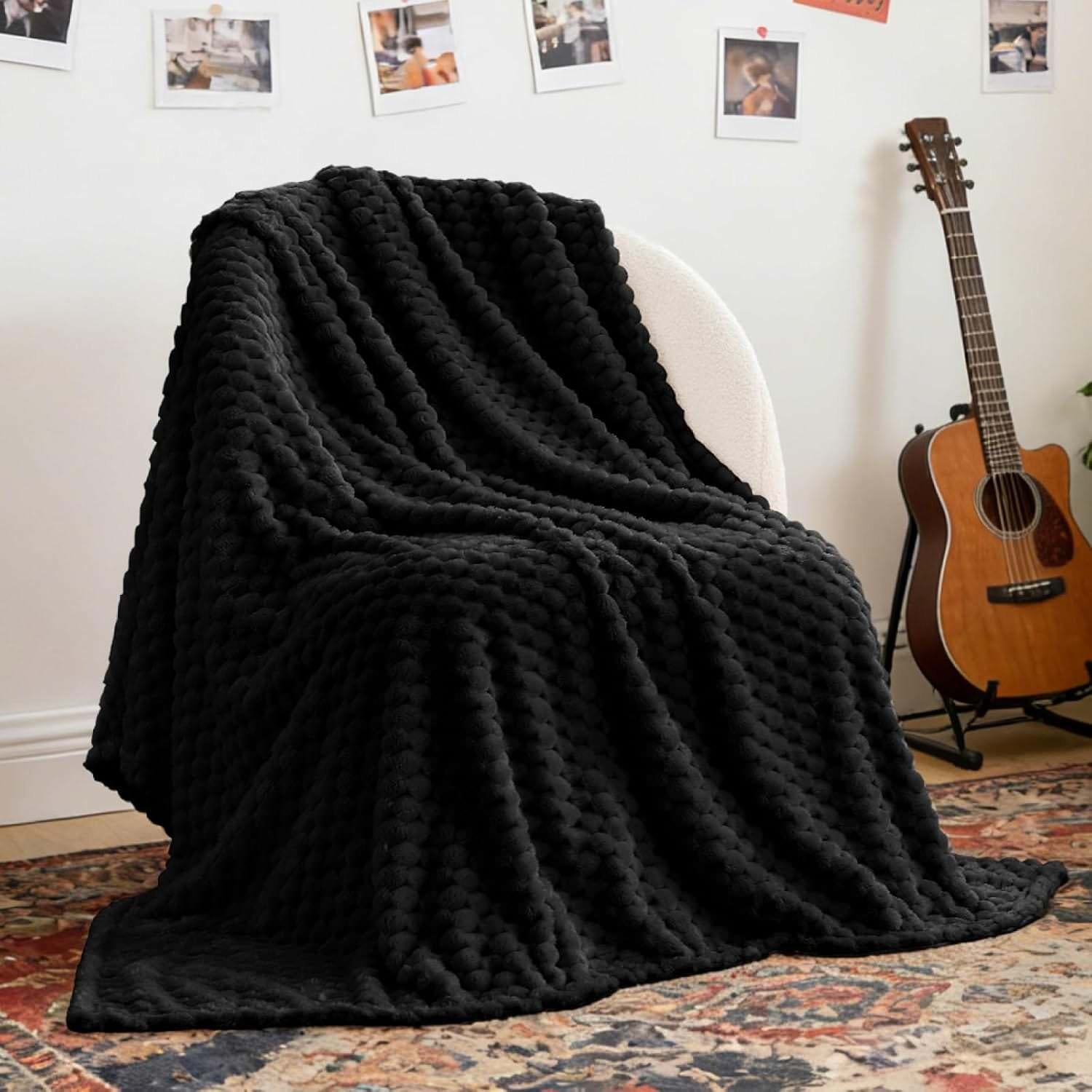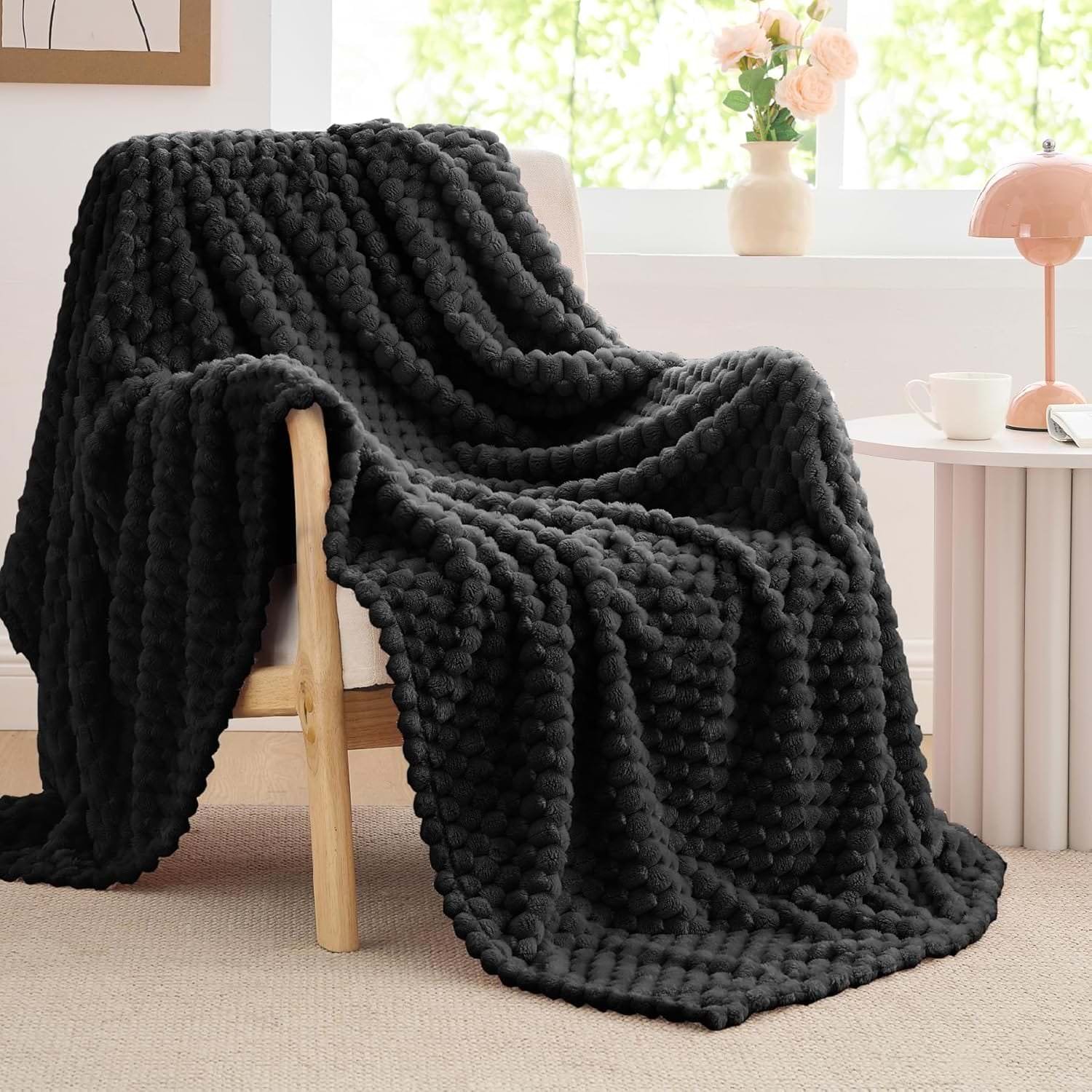 Dekoracyjny, wypukły wzór pięknie podkreśla strukturę koca i sprawia, że produkt wygląda efektownie nawet wtedy, gdy jest swobodnie ułożony na fotelu, sofie lub łóżku. Czarny kolor dodaje wnętrzu wyrazistości, głębi i eleganckiego charakteru. Dobrze komponuje się z bielą, beżem, szarością, drewnem, szkłem oraz złotymi lub srebrnymi dodatkami.