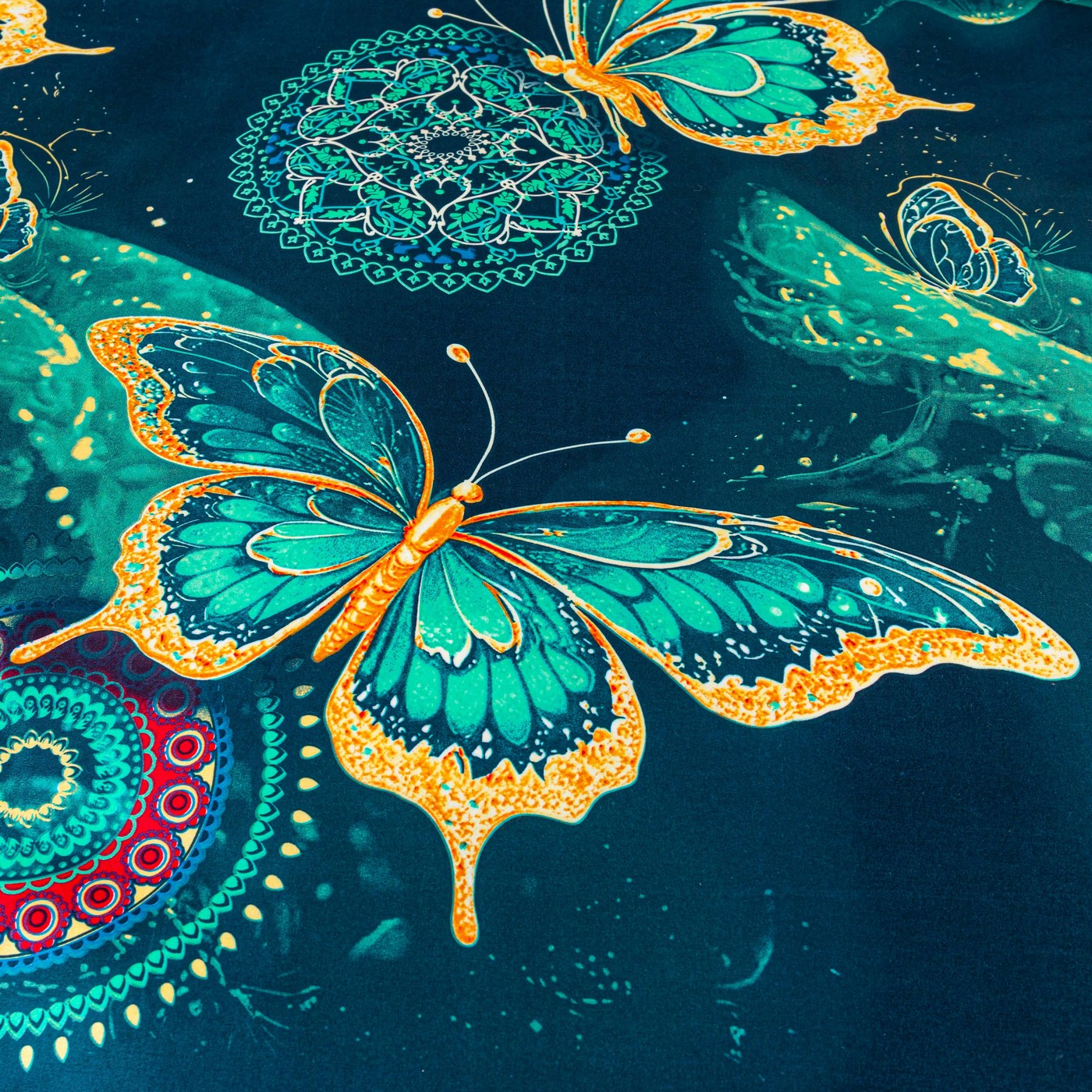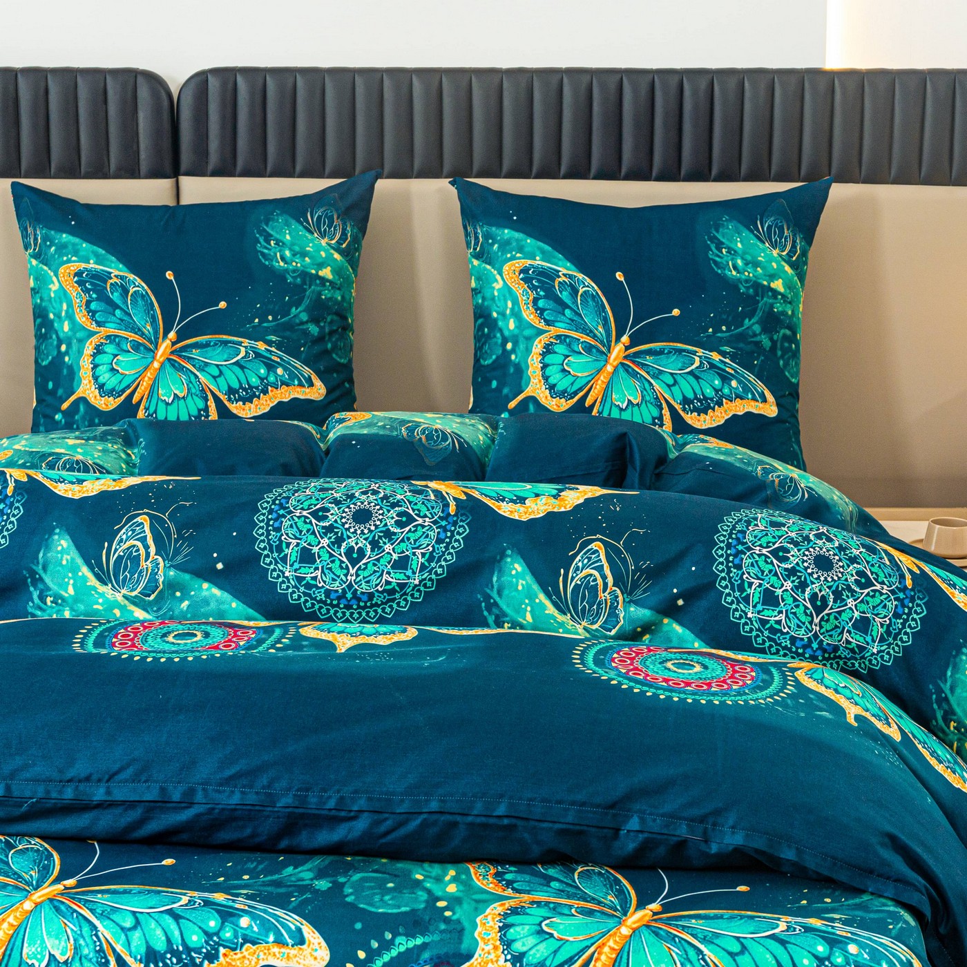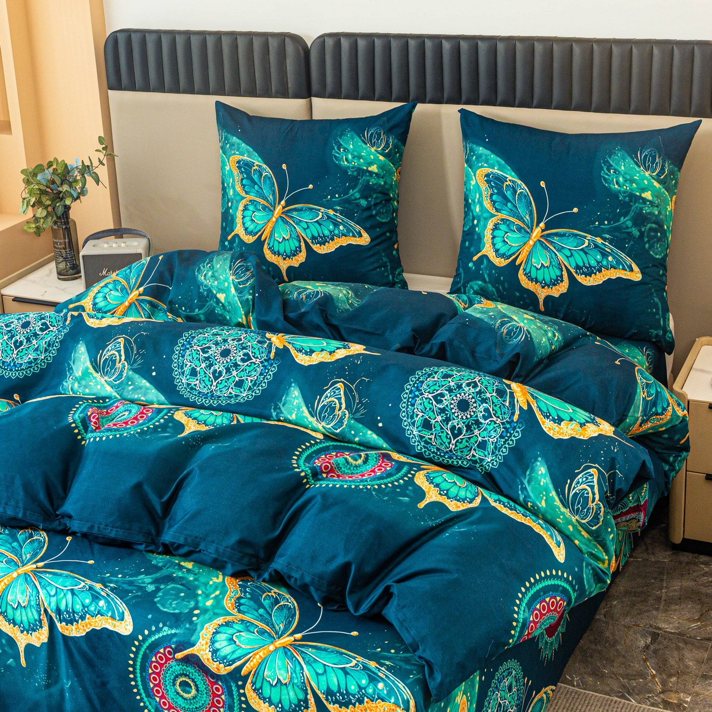 Ciemnoturkusowe tło pięknie podkreśla wzór dużych motyli w odcieniach turkusu i złota. Dekoracyjne mandale oraz subtelne ornamenty dodają całości wyjątkowego, lekko orientalnego charakteru. Taki komplet pościeli świetnie pasuje do nowoczesnej, eleganckiej i przytulnej sypialni. Jeśli szukasz alternatywy dla klasycznej pościeli bawełnianej, ten komplet z mikrofibry będzie praktycznym i efektownym wyborem na co dzień.