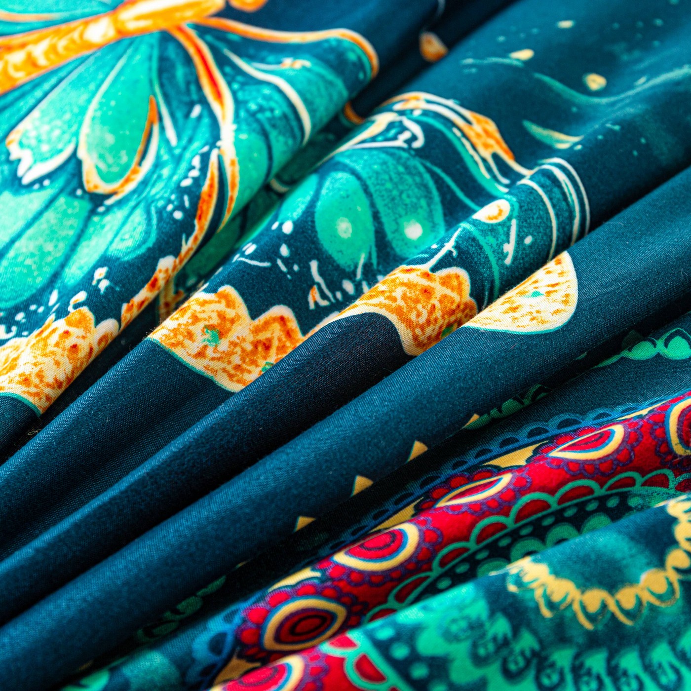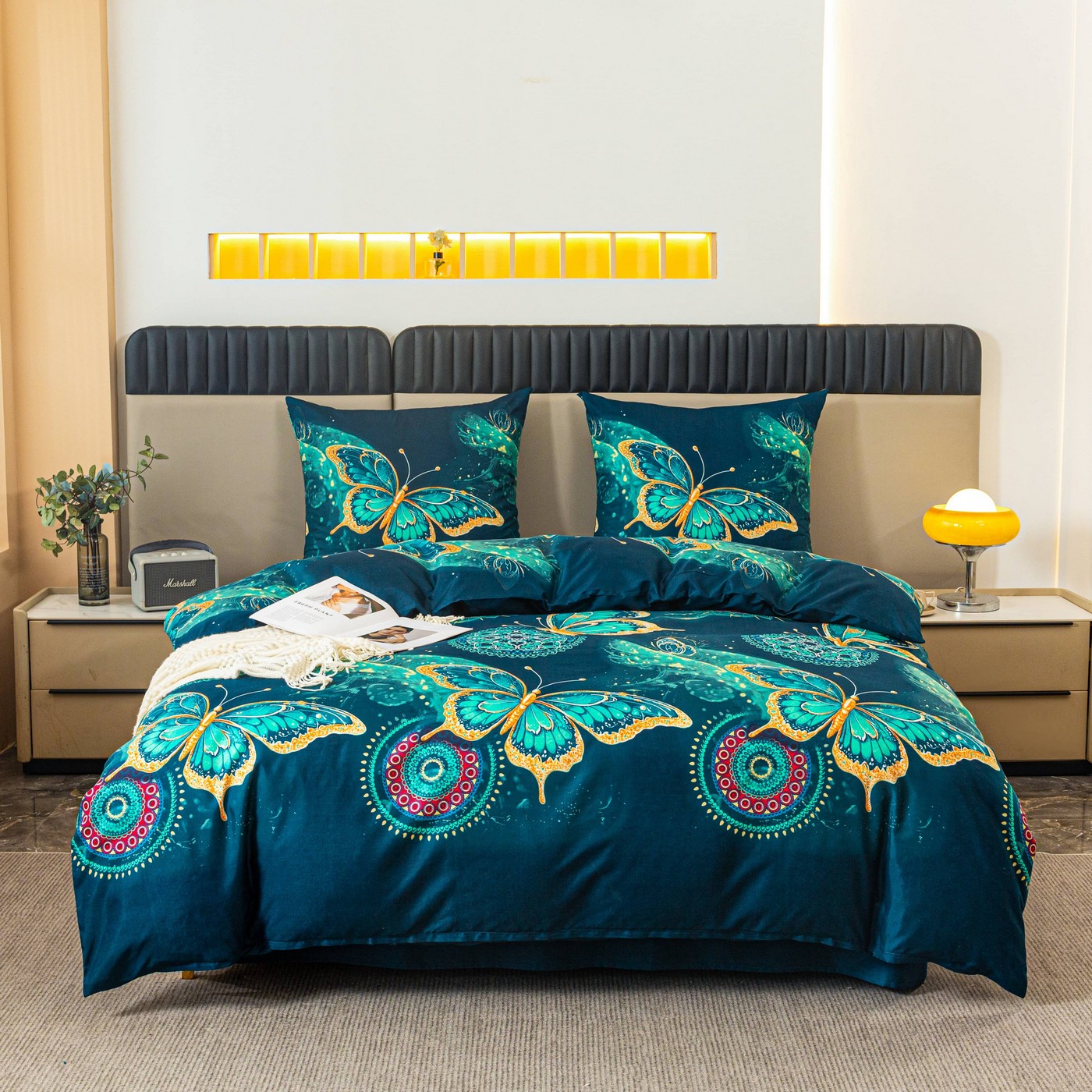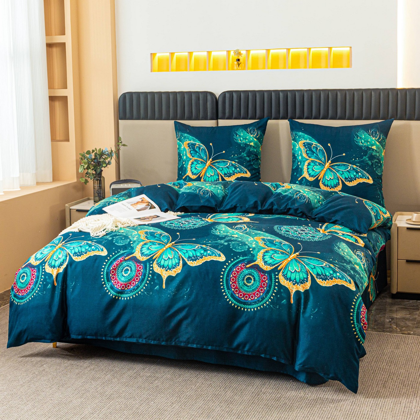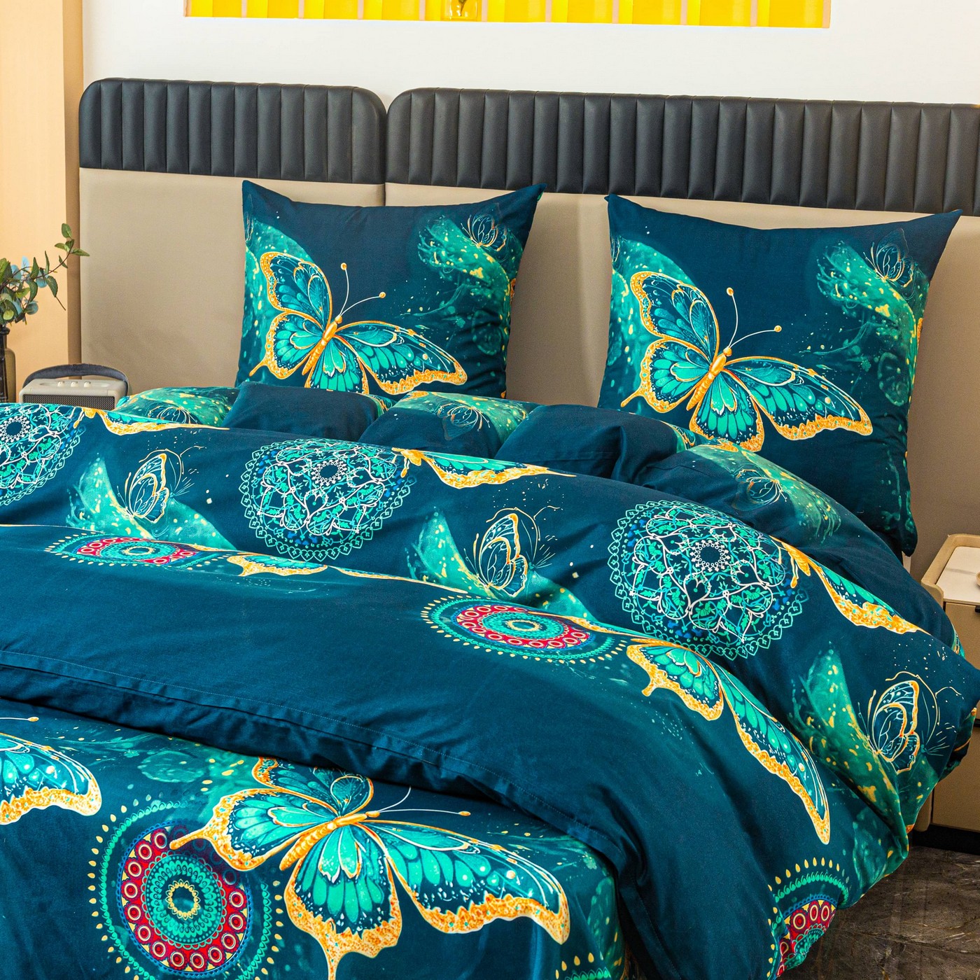 Ciemnoturkusowe tło pięknie podkreśla wzór dużych motyli w odcieniach turkusu i złota. Dekoracyjne mandale oraz subtelne ornamenty dodają całości wyjątkowego, lekko orientalnego charakteru. Taki komplet pościeli świetnie pasuje do nowoczesnej, eleganckiej i przytulnej sypialni. Jeśli szukasz alternatywy dla klasycznej pościeli bawełnianej, ten komplet z mikrofibry będzie praktycznym i efektownym wyborem na co dzień.