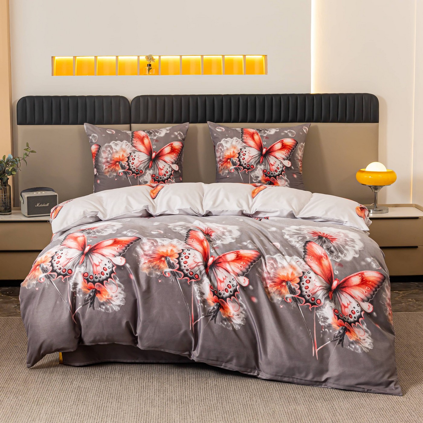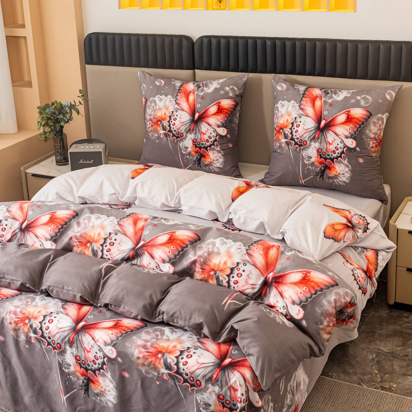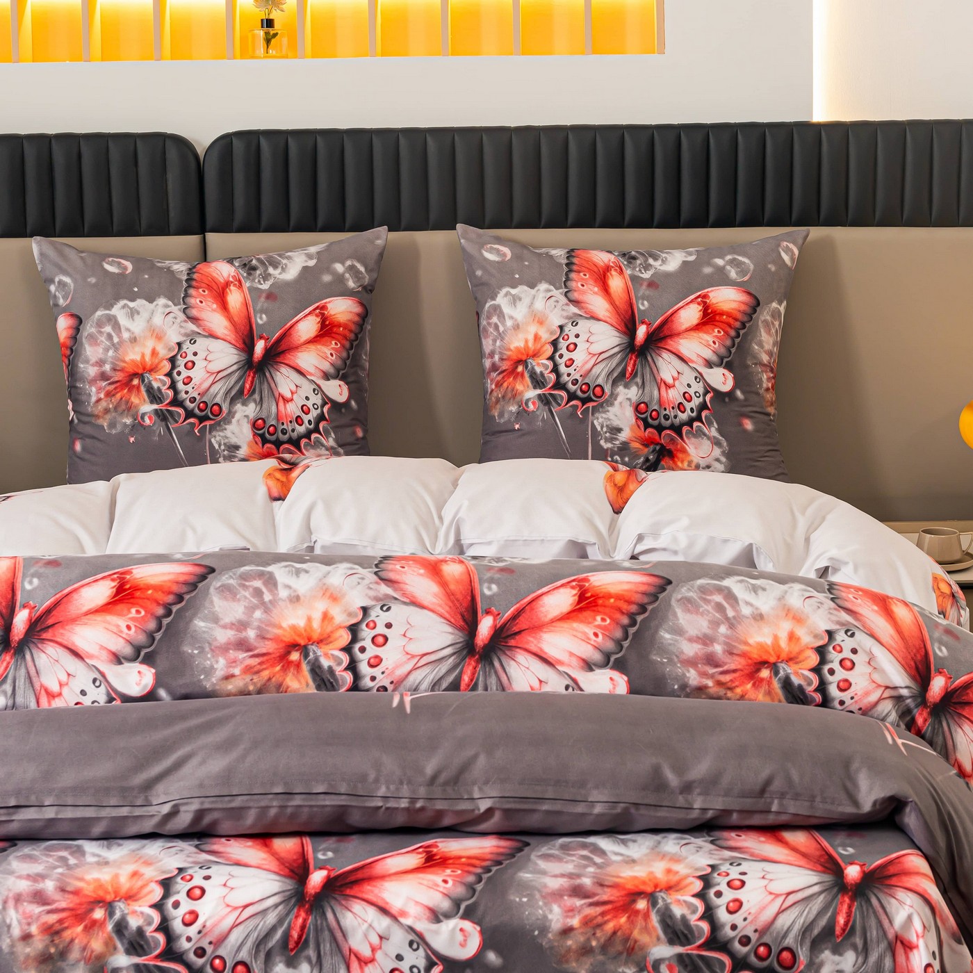 Szare tło nadaje całości elegancji i sprawia, że komplet pościeli łatwo dopasować do wielu aranżacji sypialni. Motyle w odcieniach czerwieni, bieli i czerni pięknie ożywiają wzór, a kwiatowe akcenty dodają mu lekkości. Taka pościel 160x200 będzie dobrze wyglądać zarówno w nowoczesnym wnętrzu, jak i w bardziej klasycznej, przytulnej sypialni.