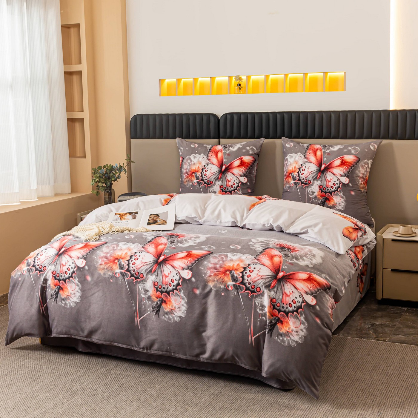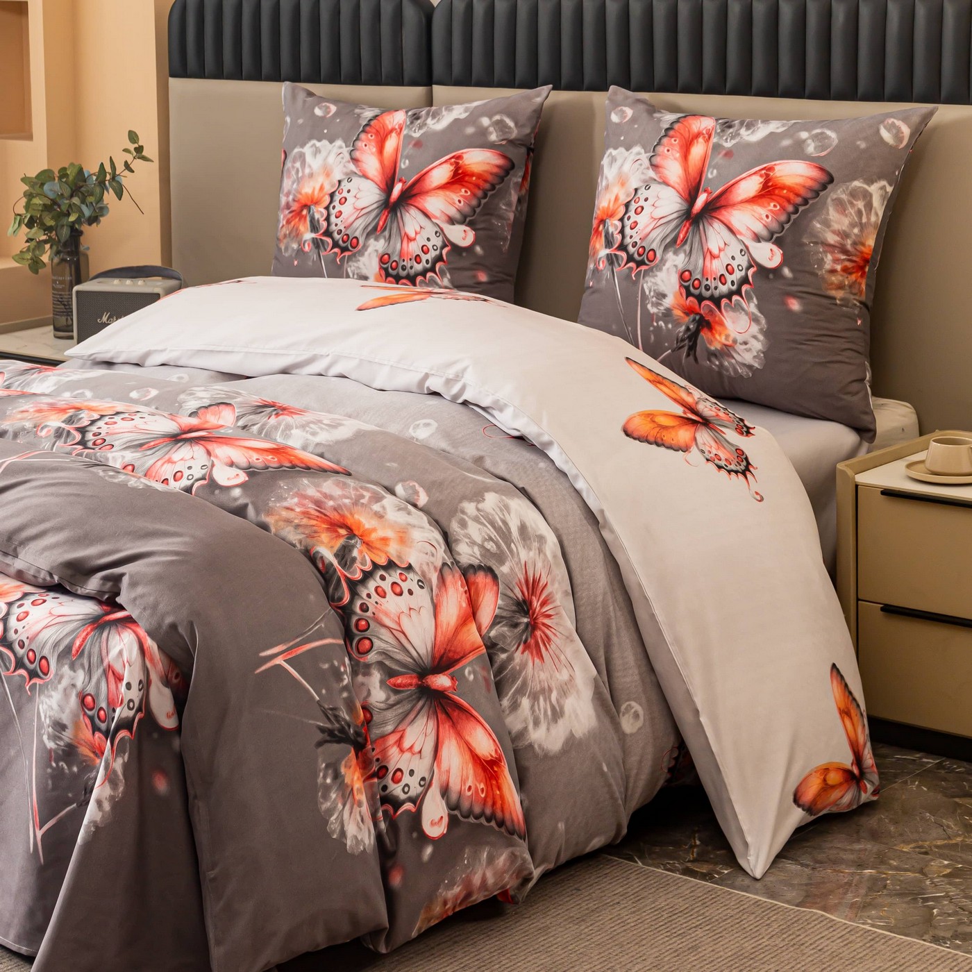 Odśwież sypialnię elegancką pościelą 160x200 w spokojnym szarym kolorze, ozdobioną subtelnym motywem motyli i kwiatów. To komplet, który łączy delikatność wzoru z nowoczesnym, przytulnym wyglądem.