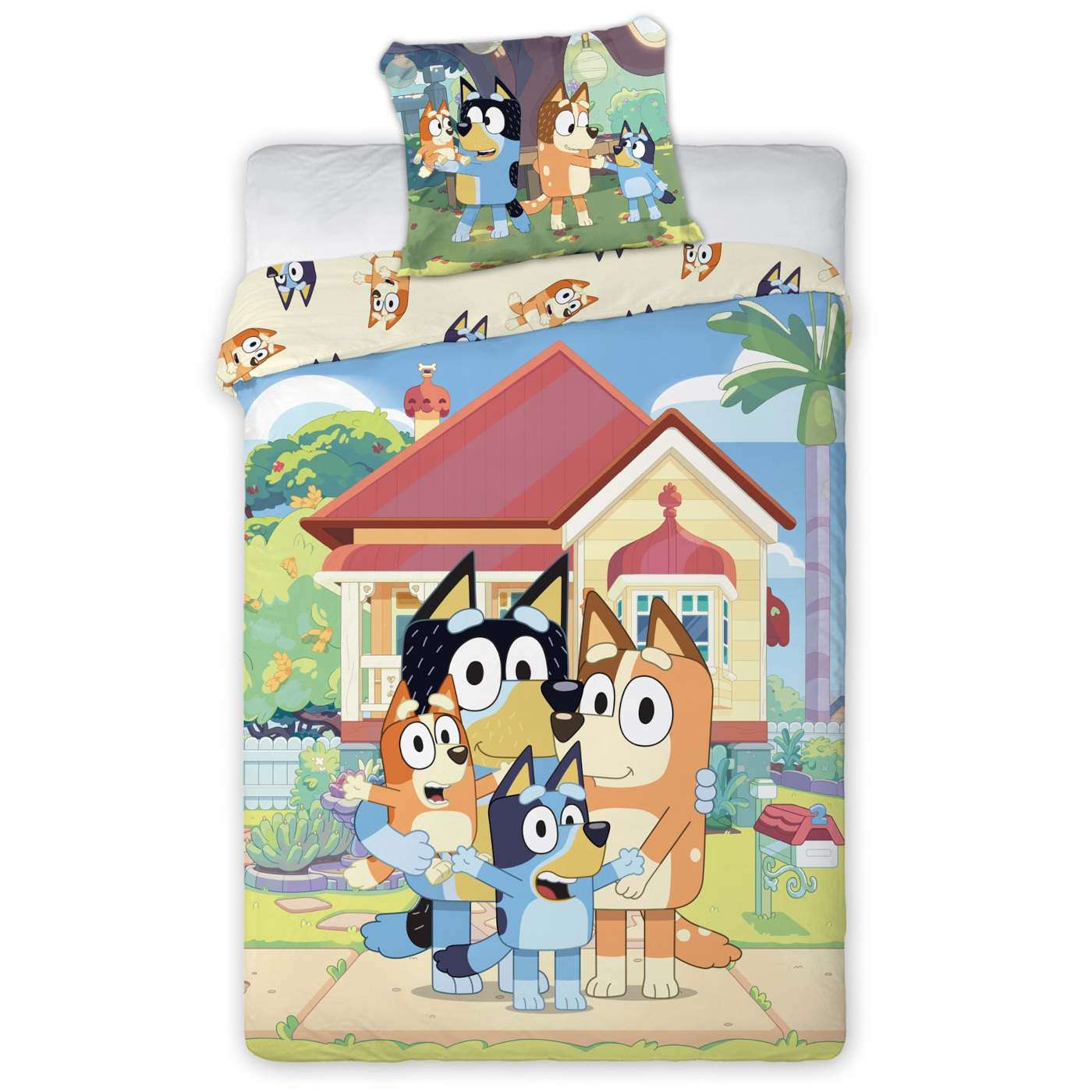 Wzór Bluey 023 wyróżnia się pogodną grafiką z bohaterami bajki na tle domu i ogrodu. Jasne, wielokolorowe barwy pięknie ożywiają pokój dziecięcy, a motyw z ulubionej bajki zachęca dziecko do odpoczynku i wieczornych rytuałów. To posciel dziecieca, która łączy bajkowy wygląd z wygodą potrzebną najmłodszym.