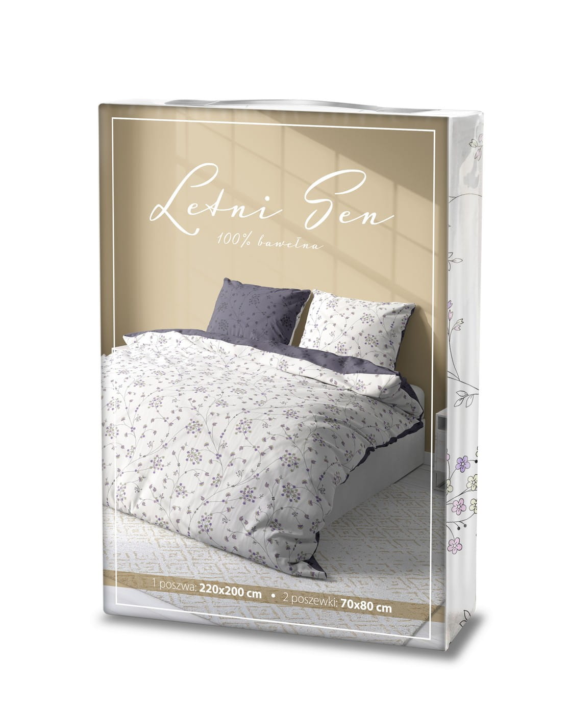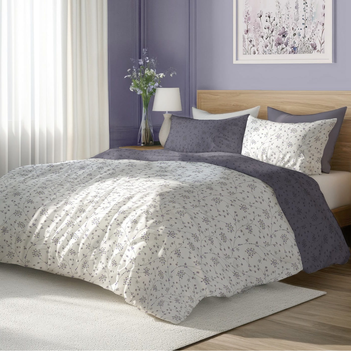 Pościel ozdobiona jest delikatnym, powtarzalnym motywem drobnych gałązek w odcieniach szarości i fioletu. Białe tło dodaje lekkości, a rewers w ciemniejszym kolorze nadaje głębi i pozwala odmienić aranżację jednym ruchem. To elegancka i ponadczasowa propozycja do każdej sypialni.