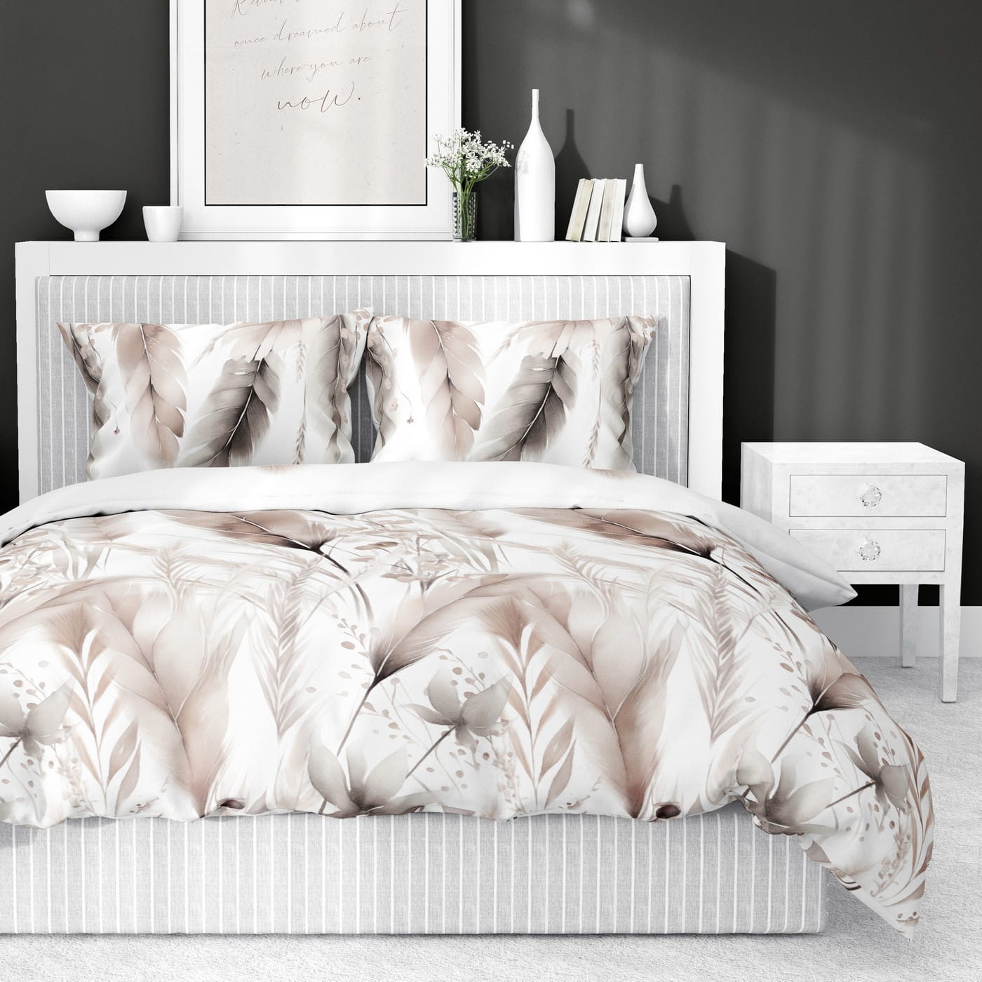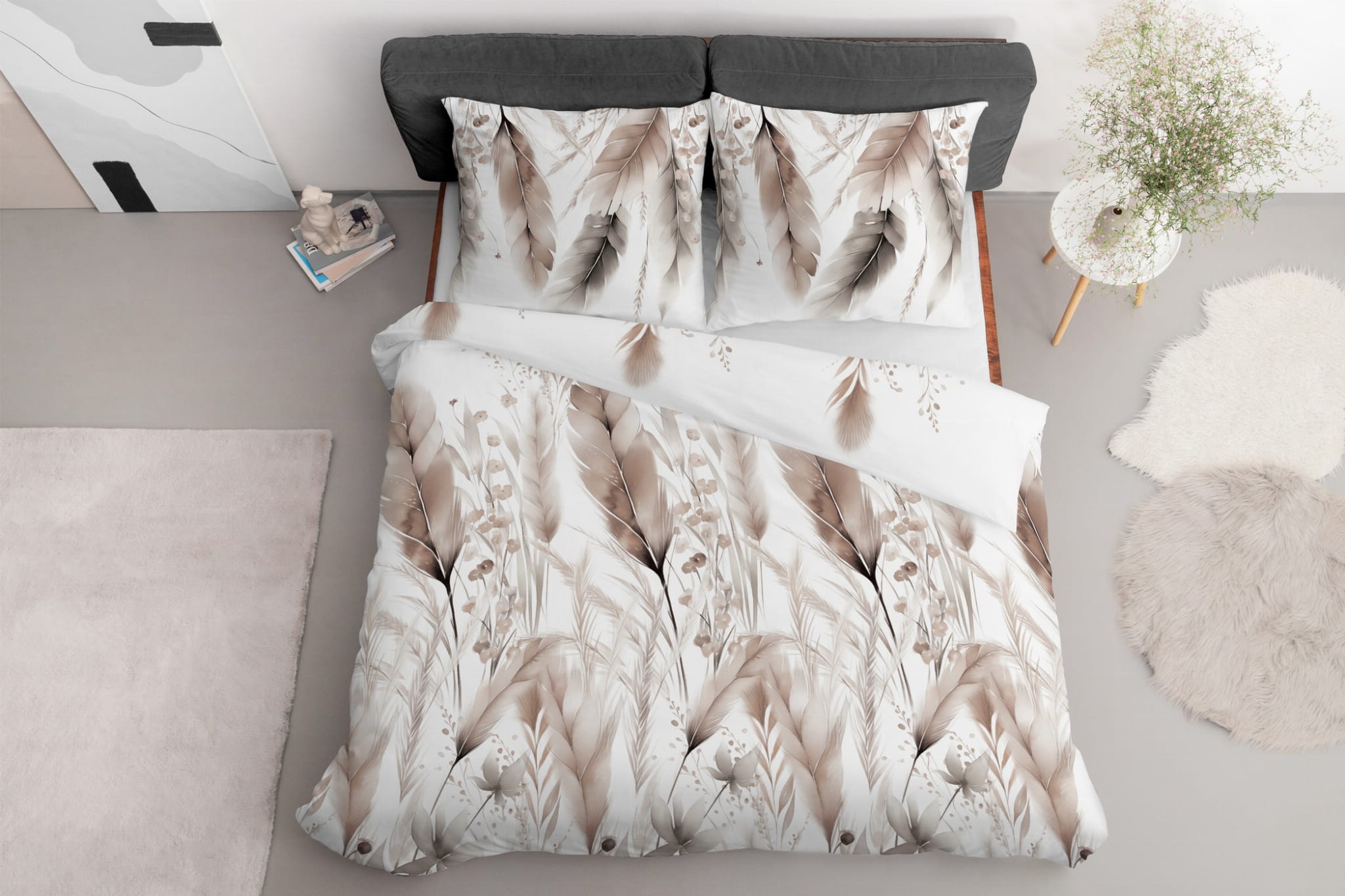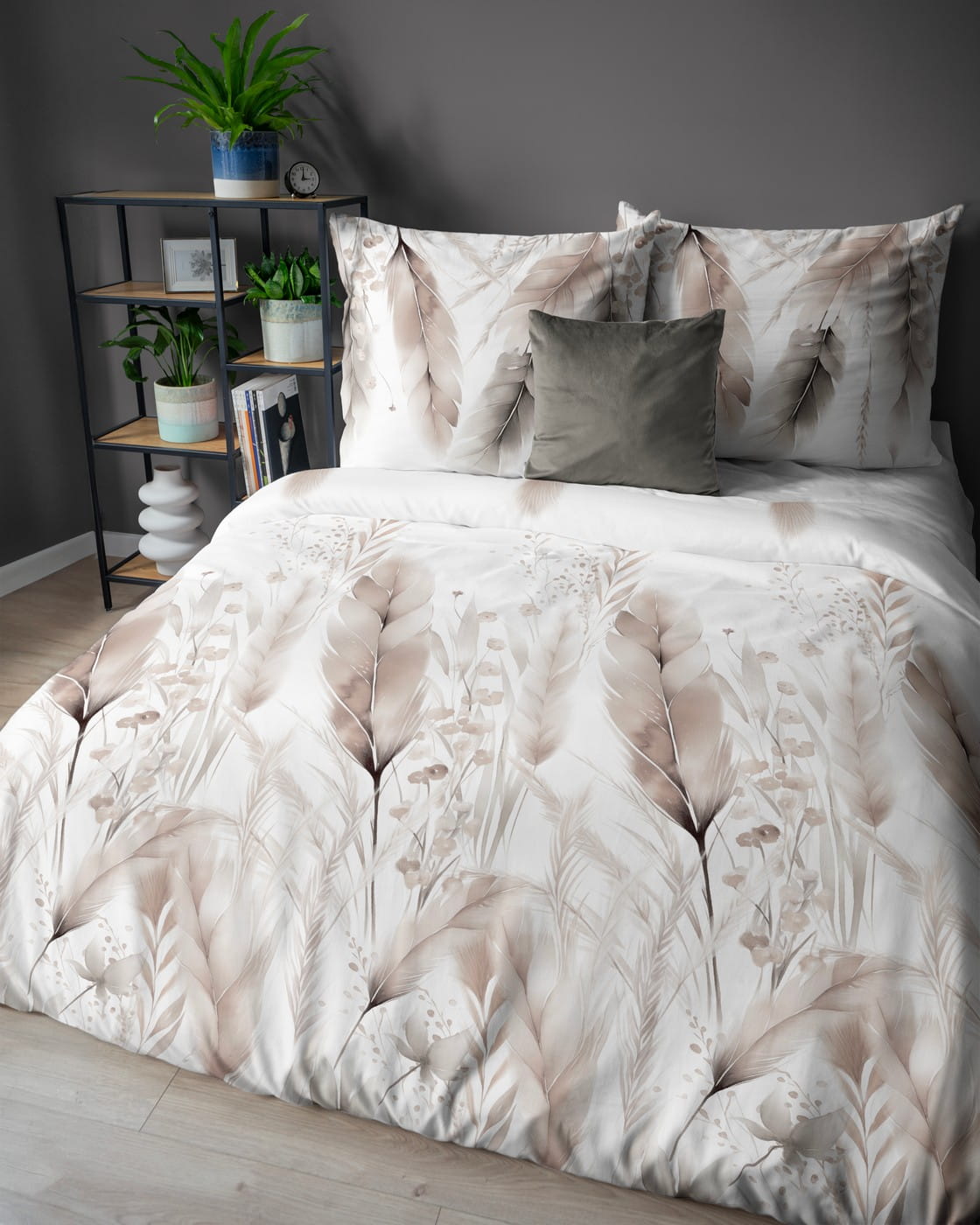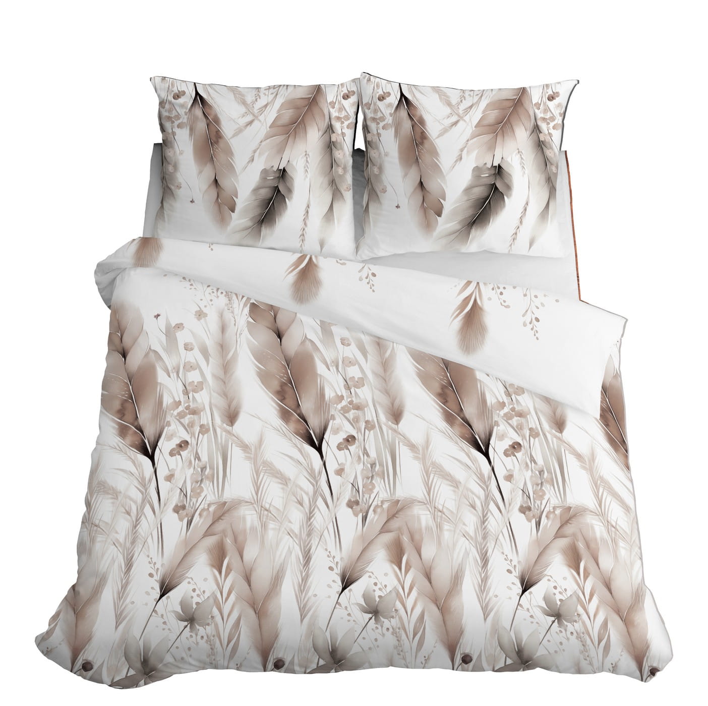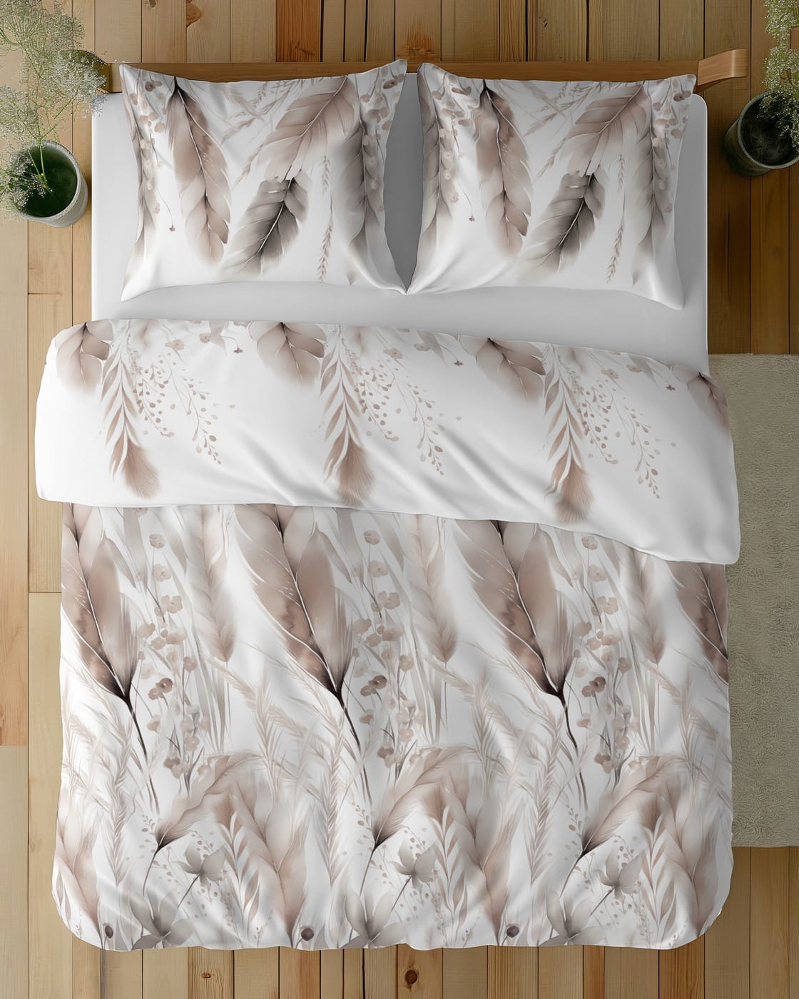 Pościel 200x220 bawełna satynowa wyróżnia się motywem lekkich, beżowo-brązowych piór, które układają się w delikatny, harmonijny deseń. Ciepła kolorystyka beżu, cappuccino i ecru doskonale współgra z jasnymi wnętrzami, tworząc przytulny, kojący klimat. To idealny wybór dla miłośników natury, stylu boho lub klasycznej elegancji.