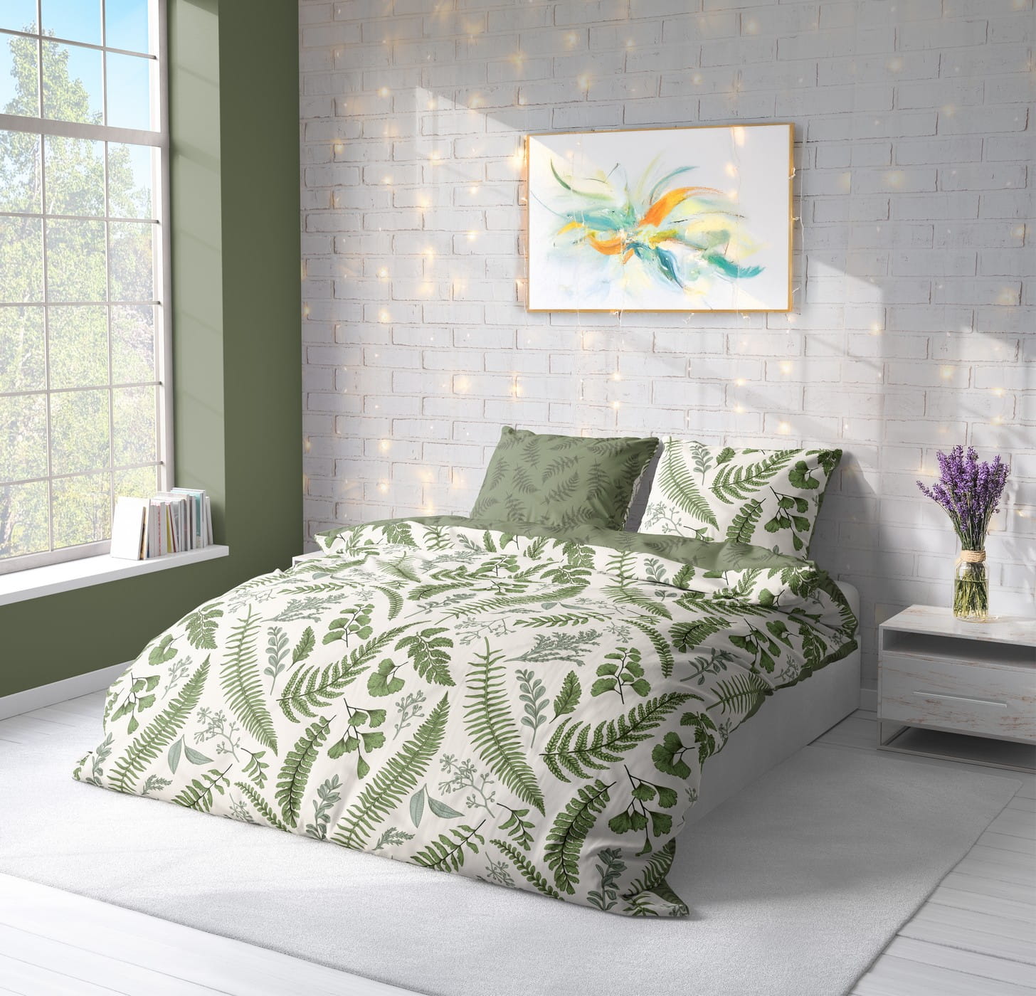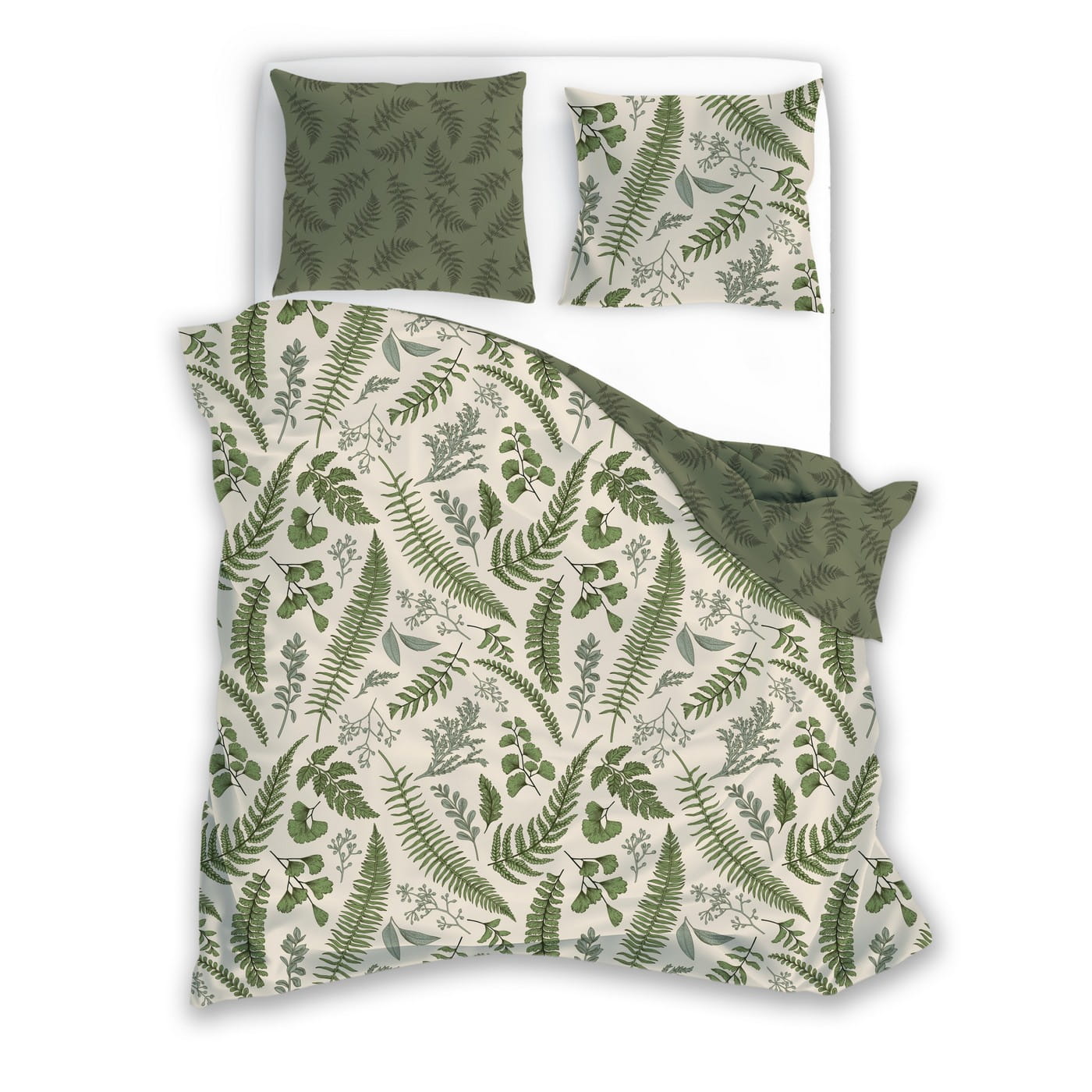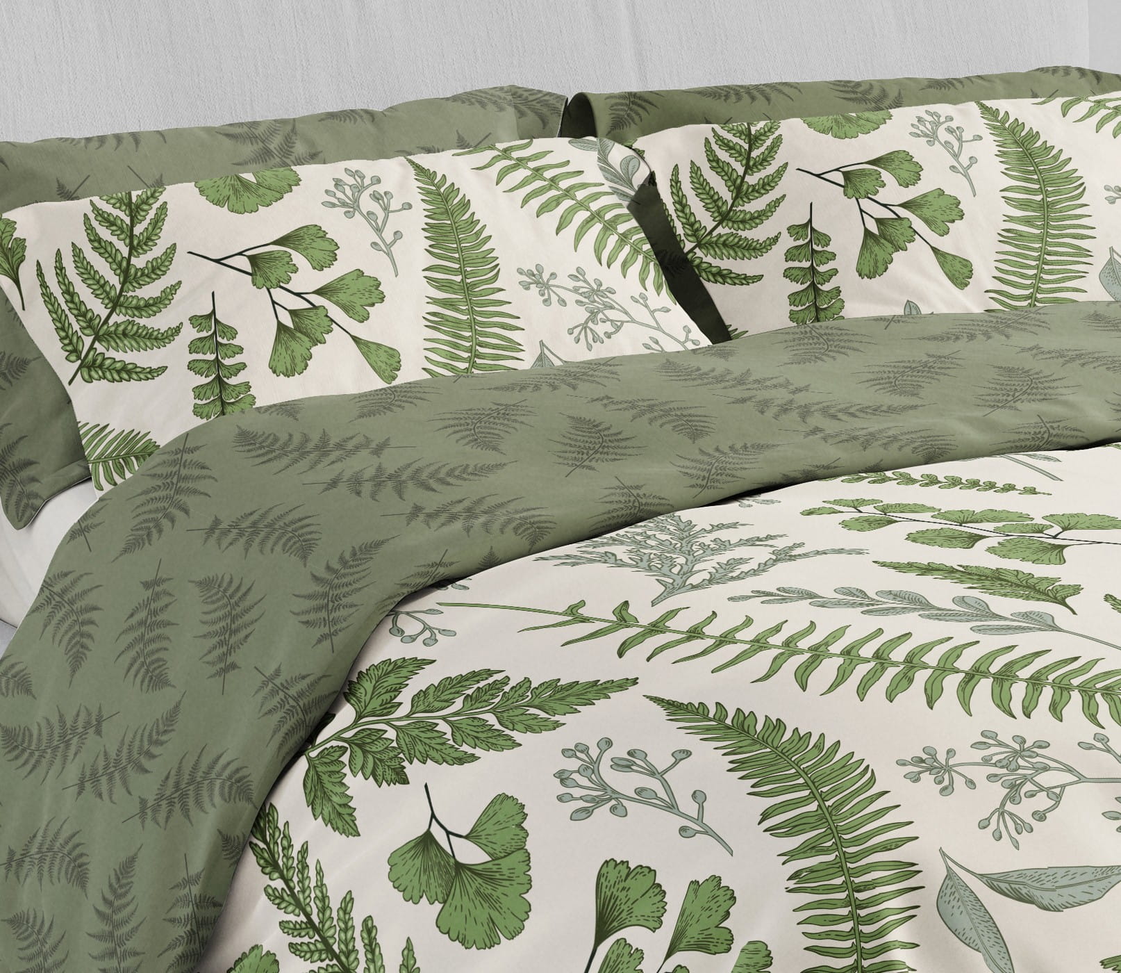 Pościel ozdobiona jest realistycznymi liśćmi paproci, eukaliptusa oraz delikatnymi gałązkami w różnych odcieniach zieleni. Naturalna paleta kolorów tworzy świeży, lekki i bardzo harmonijny efekt. Dwustronny design pozwala odmieniać aranżację sypialni — jedna strona to jasny, botaniczny print, druga to głęboka zieleń z drobnym wzorem roślinnym.