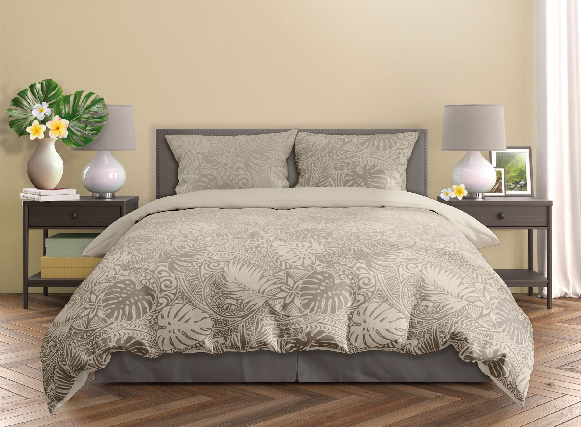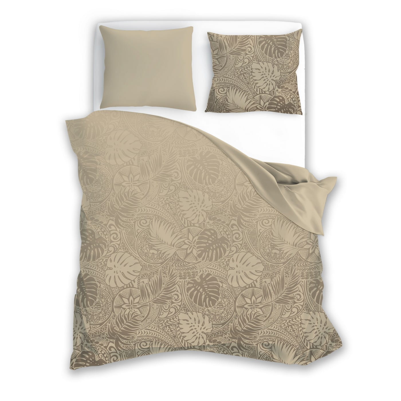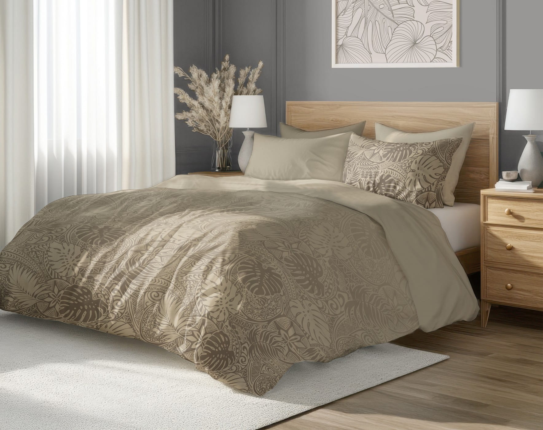 Pościel zdobi subtelny, egzotyczny motyw liści monstery i palm, który pięknie komponuje się z delikatnym tłem w ciepłym, piaskowym odcieniu. Dwustronna pościel daje możliwość szybkiej zmiany aranżacji – jedna strona to bogaty, artystyczny deseń o etnicznym charakterze, druga gładka i stonowana, idealna dla miłośników minimalistycznych wnętrz. To pościel, która doskonale podkreśli naturalny klimat sypialni.
