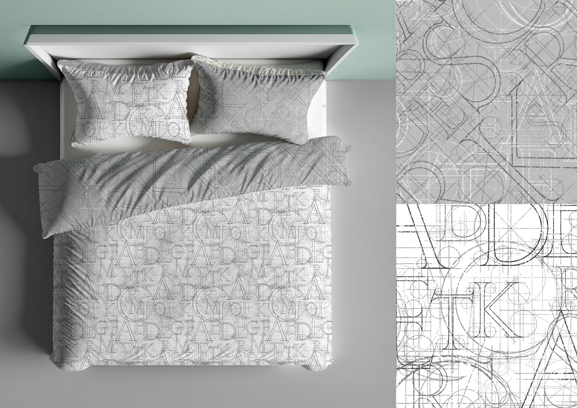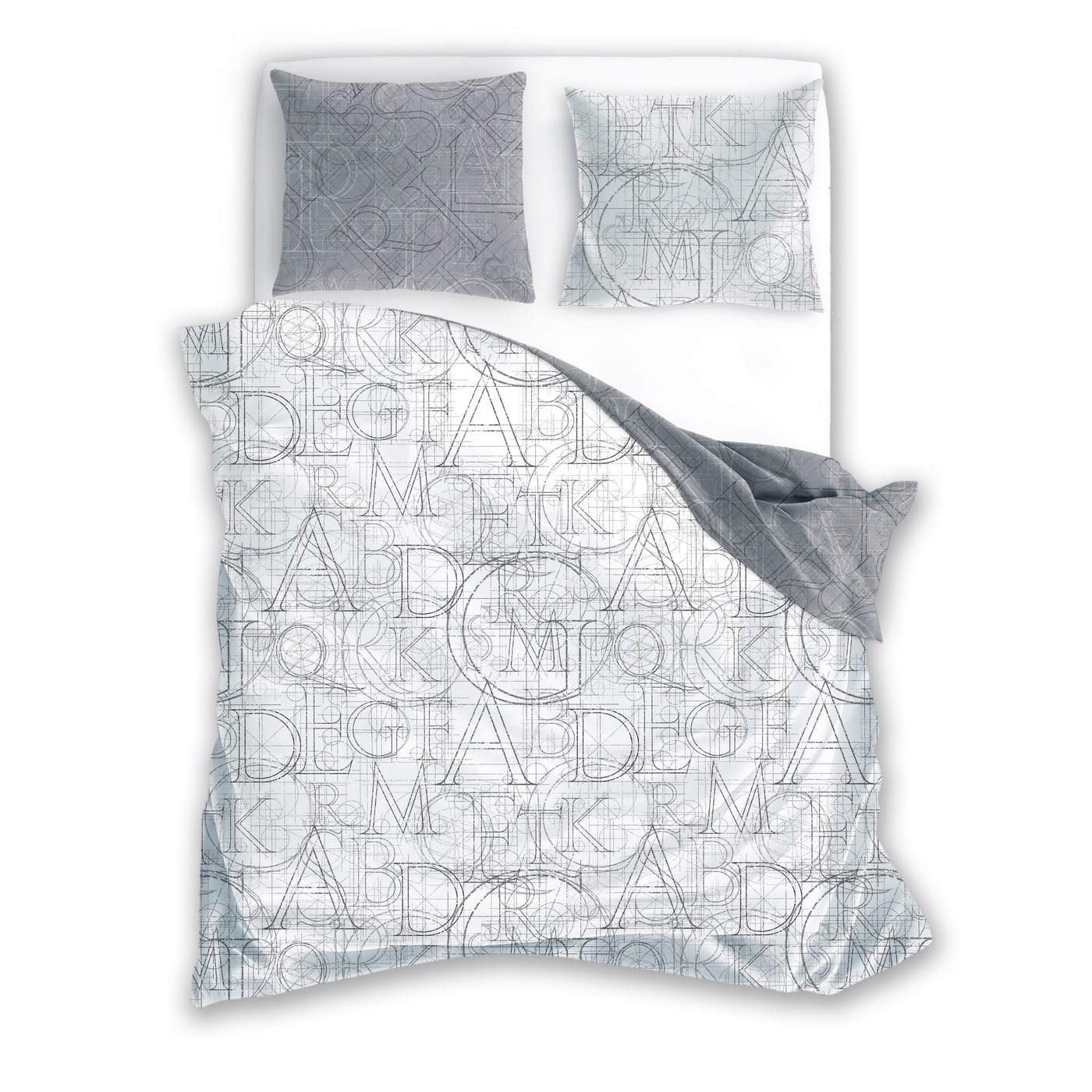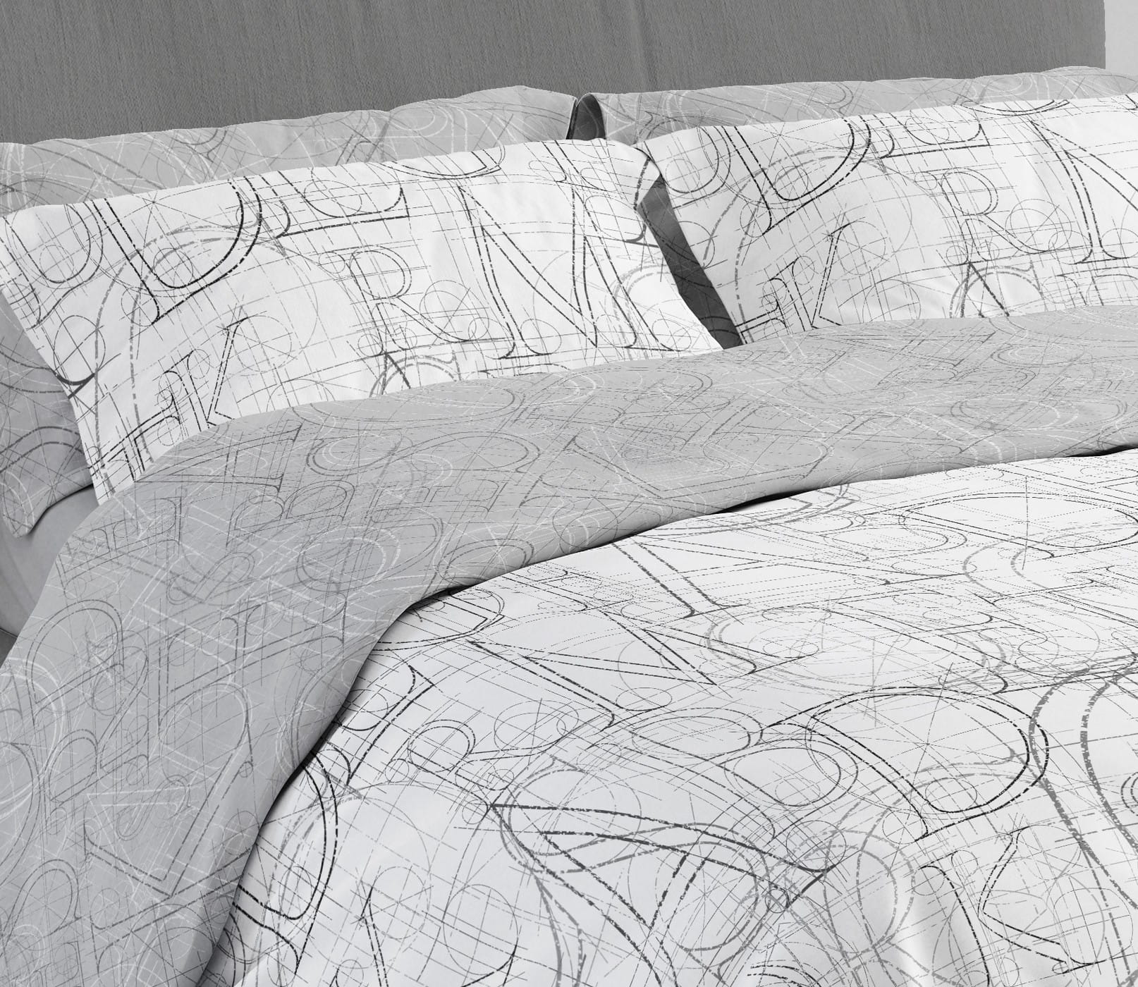 Wzór pościeli tworzą nakładające się na siebie litery, linie konstrukcyjne i geometryczne szkice przywodzące na myśl rysunki architektoniczne. Całość utrzymana jest w spokojnej gamie szarości, co nadaje wnętrzu elegancji i wizualnego ładu. Dwustronność kompletu pozwala zmieniać styl w kilka chwil — jedna strona to jasne liternictwo, druga to szary, minimalistyczny print techniczny.